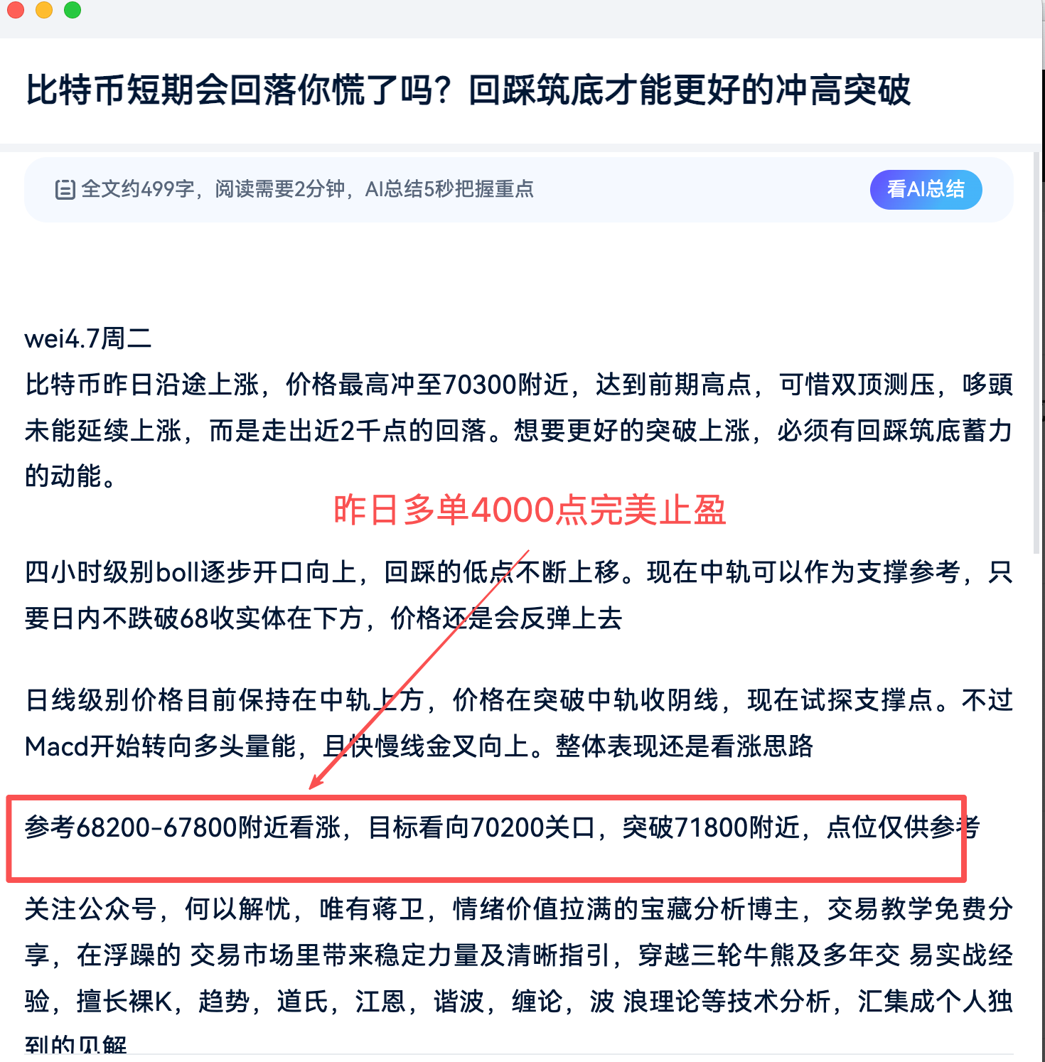 关注公众号,何以解忧,唯有蒋卫,情绪价值拉满的宝藏分析博主,交易教学免费分享,在浮躁的 交易市场里带来稳定力量及清晰指引,穿越三轮牛熊及多年交 易实战经验,擅长裸K,趋势,道氏,江恩,谐波,缠论,波 浪理论等技术分析,汇集成个人独到的见解