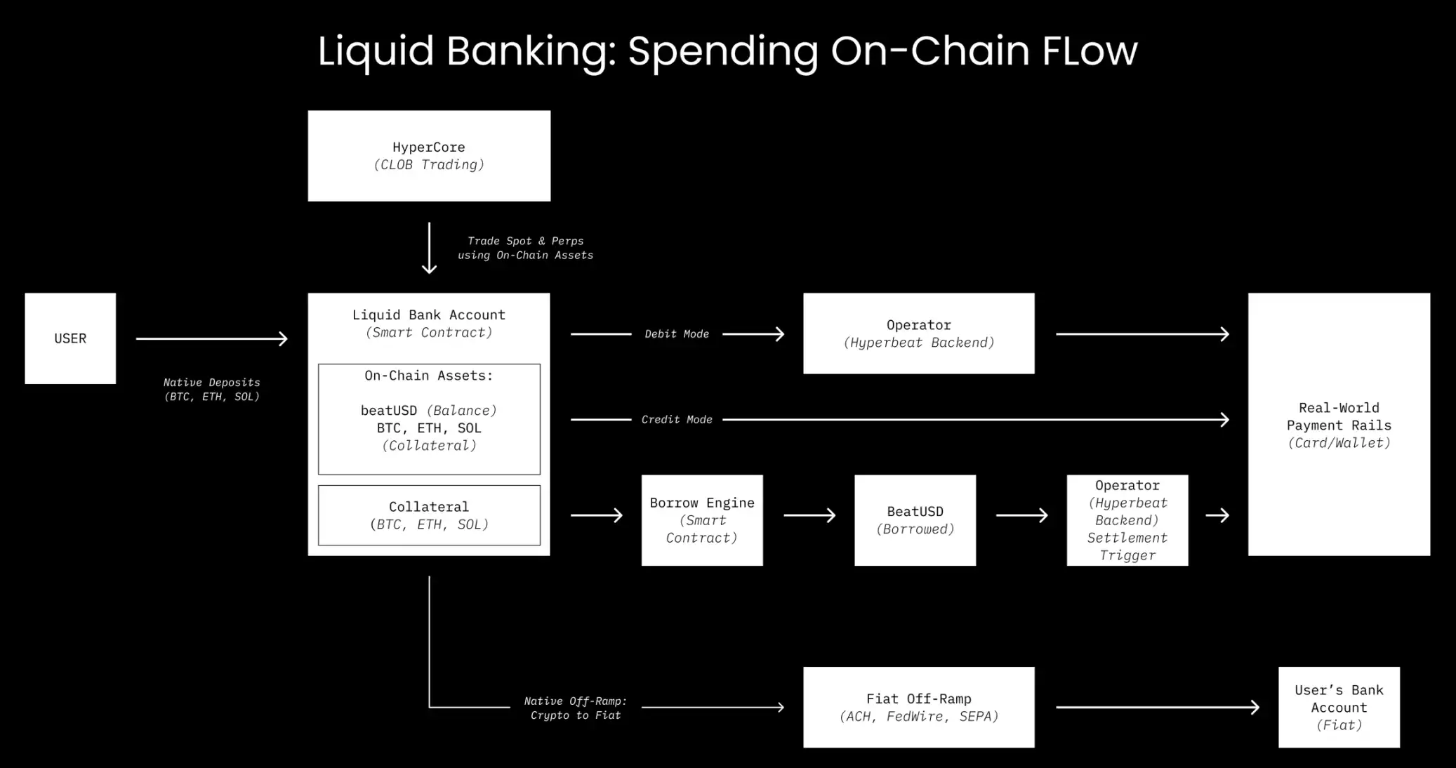 On April 8th, the Hyperliquid native protocol Hyperbeat launched Liquid Banking, a self-custodied "bank" deployed on HyperEVM, integrating stablecoin deposits, VISA card payments, perpetual contract trading, and multi-currency fiat fund inflows and outflows into a single on-chain smart wallet.