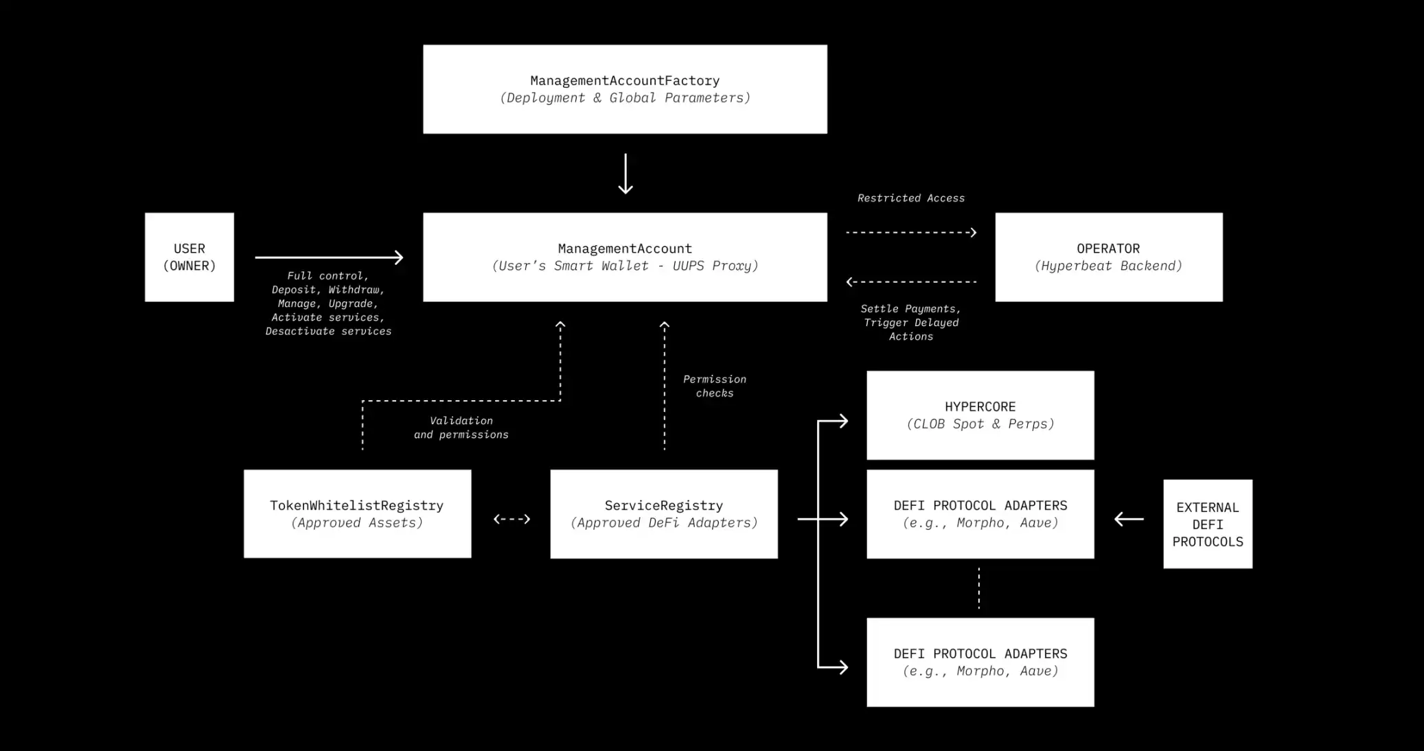 Unlike all centralized crypto cards, user assets remain under the control of their ManagementAccount smart wallet. Hyperbeat's backend only holds a limited Operator role, which can only execute settlements within user-defined limits and cannot transfer assets to unauthorized addresses.