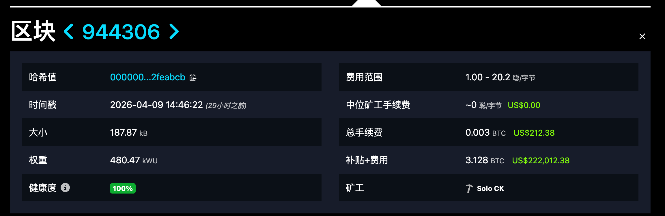 4 月 9 日,一台算力约 70 TH/s 的矿机通过 CKpool 的 solo 挖矿服务成功解出比特币区块 944,306,获得 3.128 BTC 全额区块奖励,按当时币价计算约合 22.2 万美元。其中 3.125 BTC 为区块补贴,0.003 BTC 为交易手续费。