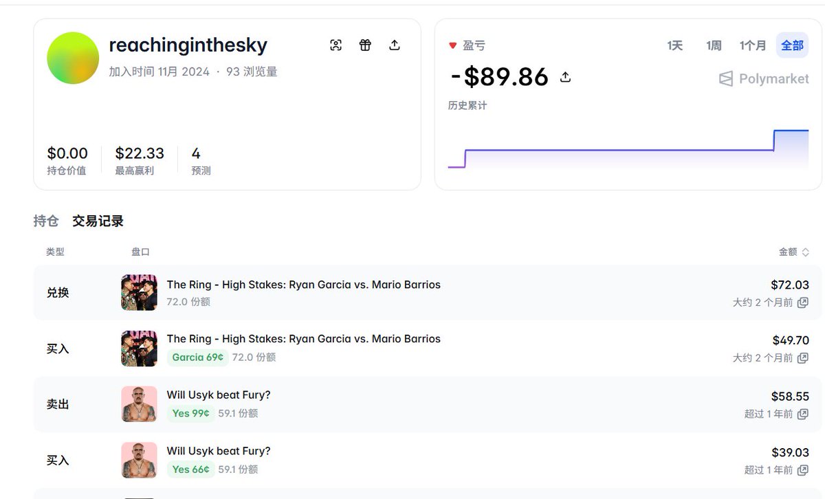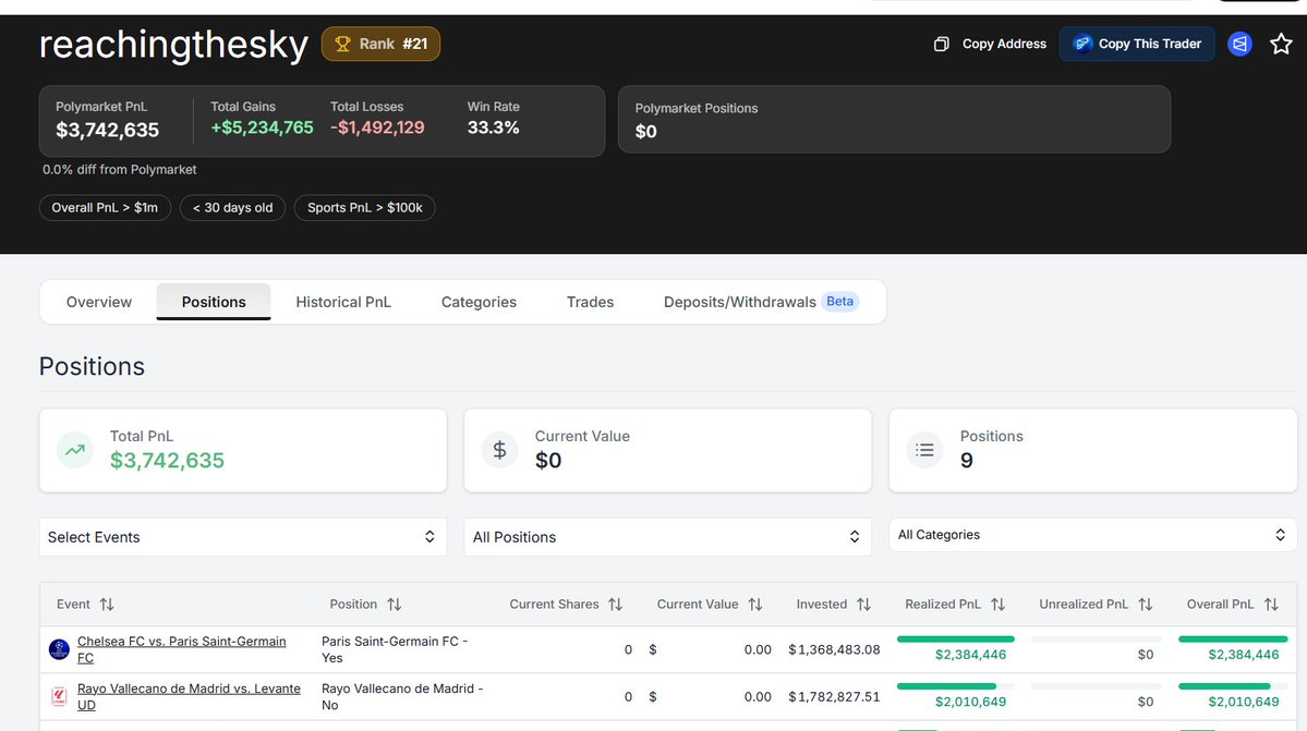 比如说这个地址reachingthesky,官网现实就是个菜逼。总共亏了90刀!实际上polygen链上的数据显示是超级大聪明!交易了8个市场,利润高达370万刀!!