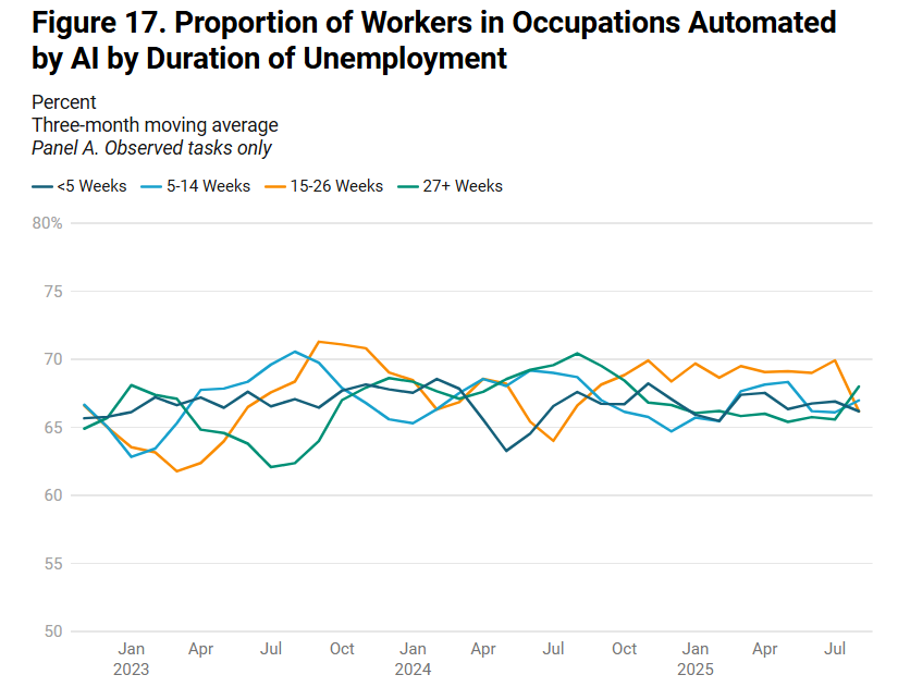 Young college graduates have struggled, with unemployment among 20- to 24-year-olds with bachelor's degrees rising to 9.3% in August from 4.4% in April. But the research team found the pattern matched that of older degree holders aged 25 to 29, indicating a broader labor market slowdown rather than AI replacement. The dissimilarity between these age groups has fluctuated within a narrow 30-33 percent range since 2021, showing no acceleration after ChatGPT's arrival.