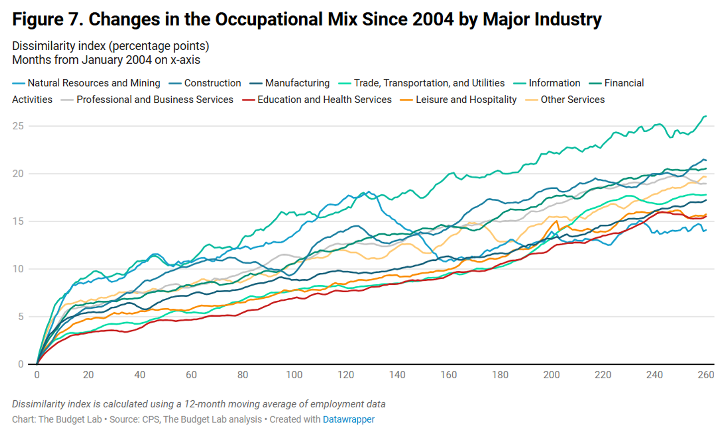 The information sector, which includes newspapers, movies, and data processing, showed the largest occupational shifts. But these changes began before ChatGPT's release, suggesting industry-specific factors rather than AI disruption. Finance and professional services displayed similar patterns—movements that predated the supposed AI revolution.