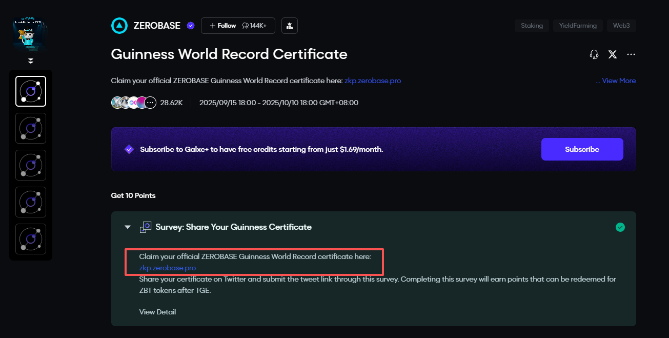 Zerobase's task link on Galxe: https://app.galxe.com/quest/zerobase/GCpgMt6rKH, with a total of 5 main tasks: