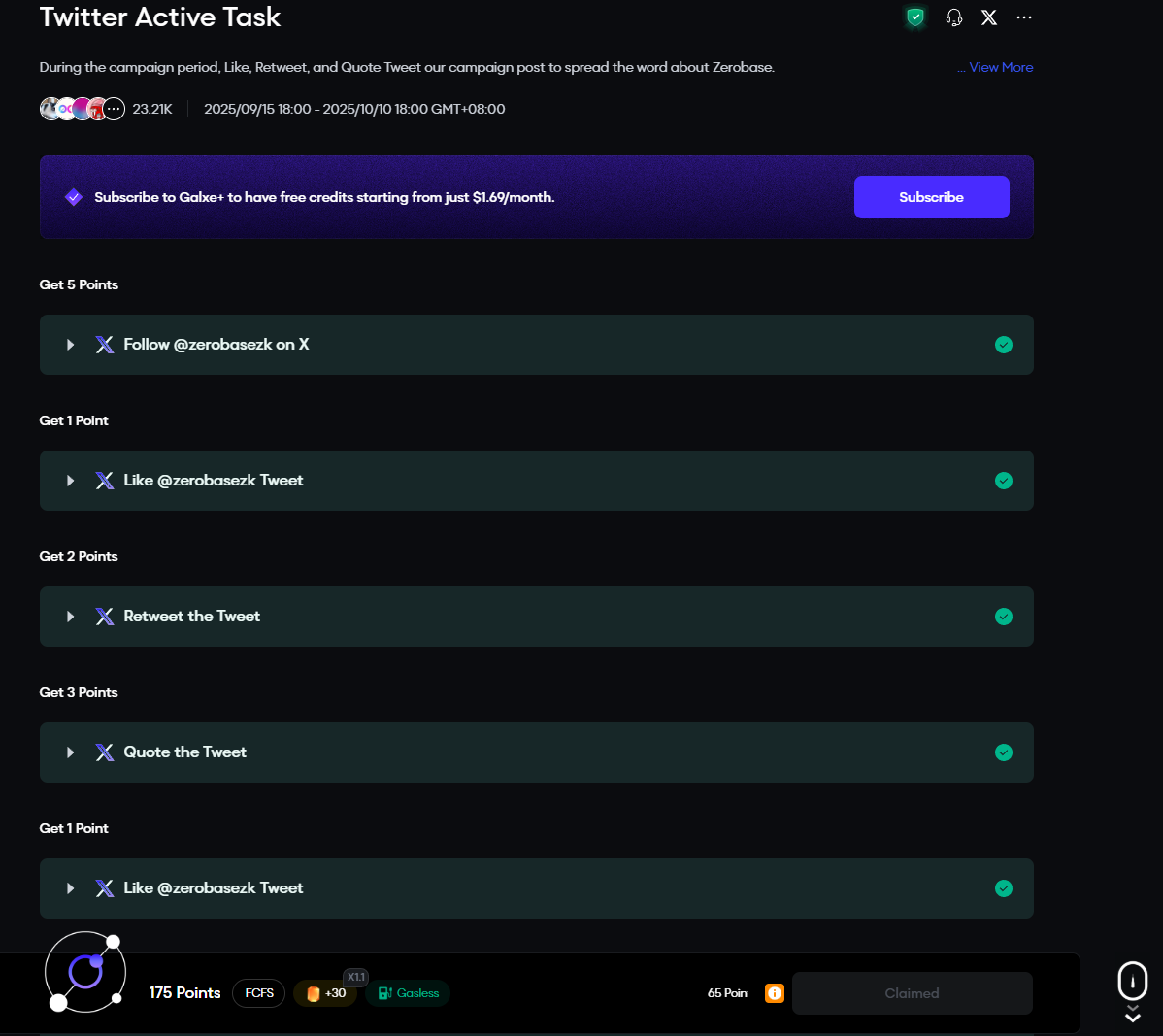 The tasks on Galxe will close tonight at 6 PM. As part of the event benefits, Zerobase will cover the necessary Gas fees for all participants on the last day of the event to ensure smooth receipt and exchange of points. This is currently the last "haircut" opportunity; seizing the chance means earning.