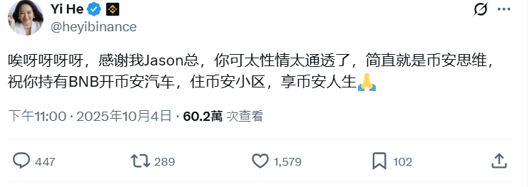 BSC's 24-hour trading volume once surpassed Solana, reaching the top, with nearly 70% coming from these "Binance series" Memes. The ignition point stemmed from the combination of community teasing and celebrity effects. Binance co-founder He Yi posted on X:
