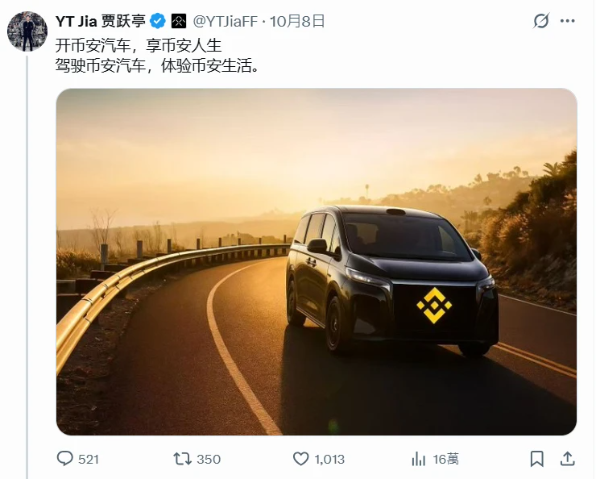 On October 8, Jia Yueting posted a picture of a car with "BNB" printed on it on Twitter, captioned "Drive a Binance Car, Enjoy a Binance Life." Although he later clarified it was unrelated to any project, it was enough to ignite the fuse for traffic.