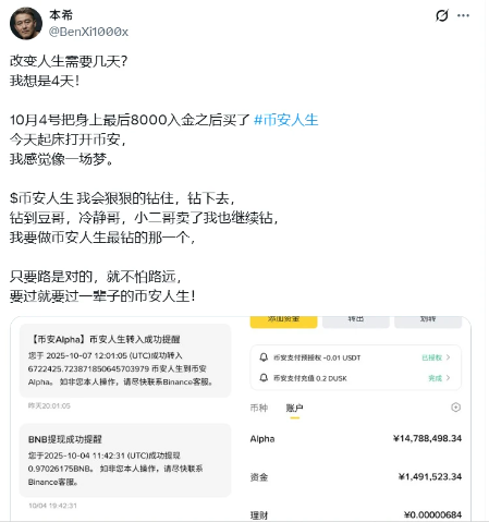 On the day "Binance Life" launched, its market cap was less than $1 million, but with community support and whale involvement, it reached 6,000 times within three days, with a market cap soaring to $500 million and a 24-hour trading volume of $325 million. Some invested $1,000, instantly multiplying it by hundreds, exclaiming they were "winners in life."