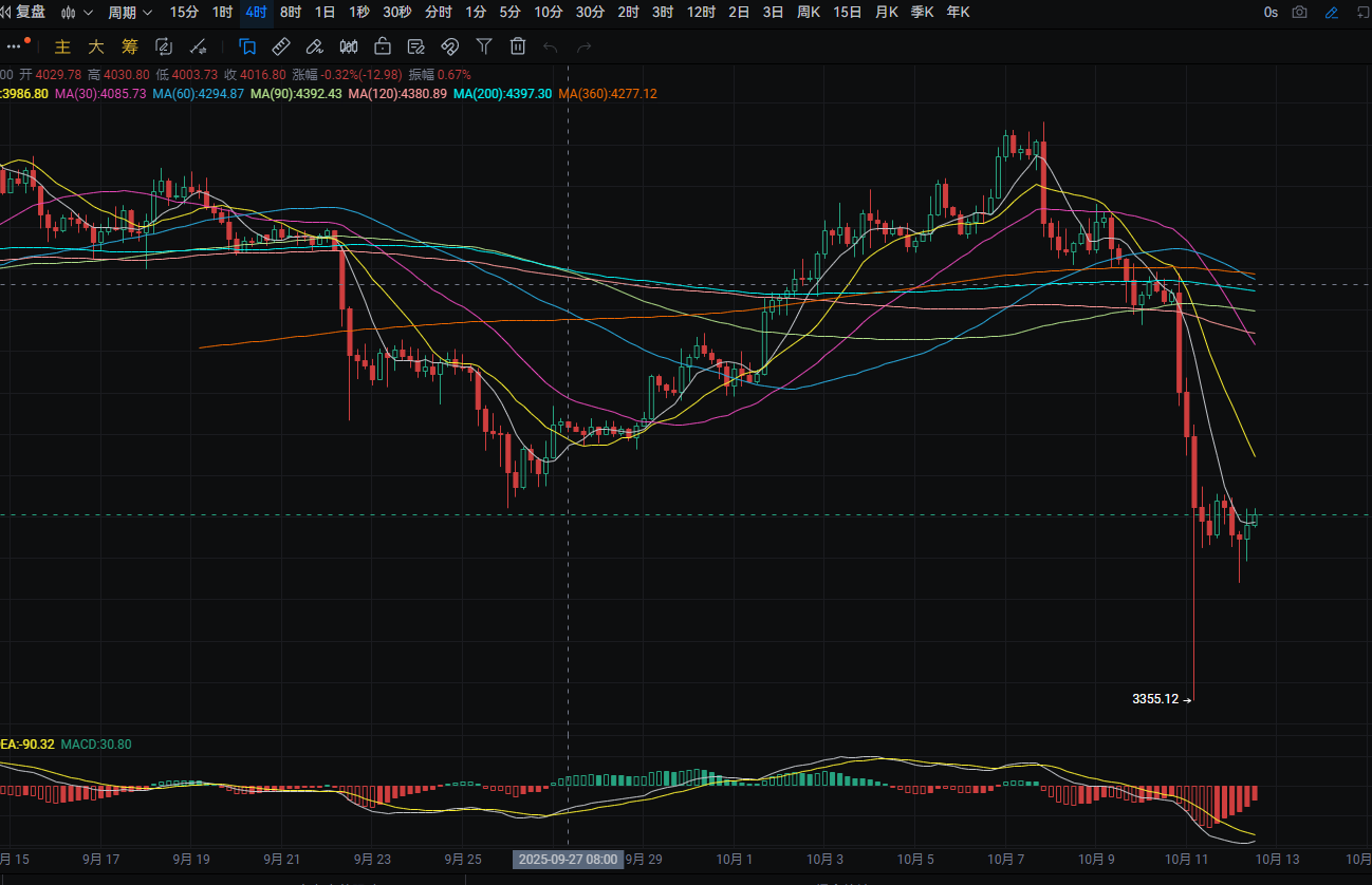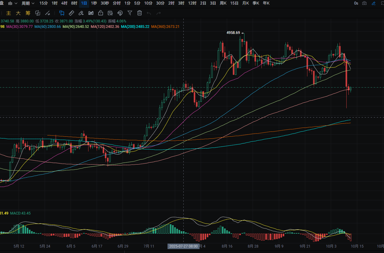 Ethereum's daily line fell from a high of around 3,875 to a low of around 3,640 yesterday, closing around 3,745. The support level is around 3,620; if it breaks, it could drop to around 3,450. A pullback can be used to buy near this level. The resistance level is around 3,905; if it breaks, it could rise to around 4,000. A rebound near this level can be used to sell. MACD shows increasing bearish momentum. The four-hour resistance level is around 3,870; if it breaks, it could rise to around 3,990. A rebound near this level can be used to sell. MACD shows decreasing bearish momentum.