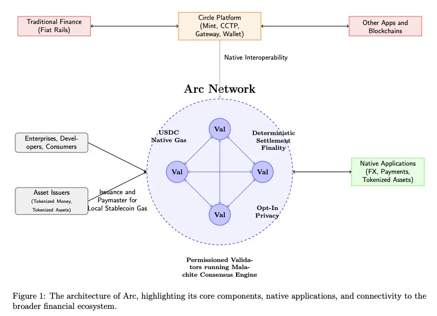 The core features of Arc include: it operates with a permissioned set of validators (running the Malachite BFT consensus engine) that provide deterministic finality; its native gas fees are paid in USDC; and it offers an optional privacy layer.