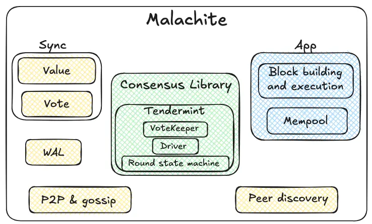 The green-labeled consensus library is the core of Malachite. Its internal round state machine adopts a Tendermint-style round mechanism (propose → pre-vote → pre-commit → commit). Voting guardians are responsible for aggregating votes and tracking the quorum. The driver coordinates these rounds over time, ensuring that the protocol continues to make decisions even if some nodes are delayed or fail. This consensus library is deliberately designed for generality: it abstracts the handling of "values," allowing different types of applications to connect.