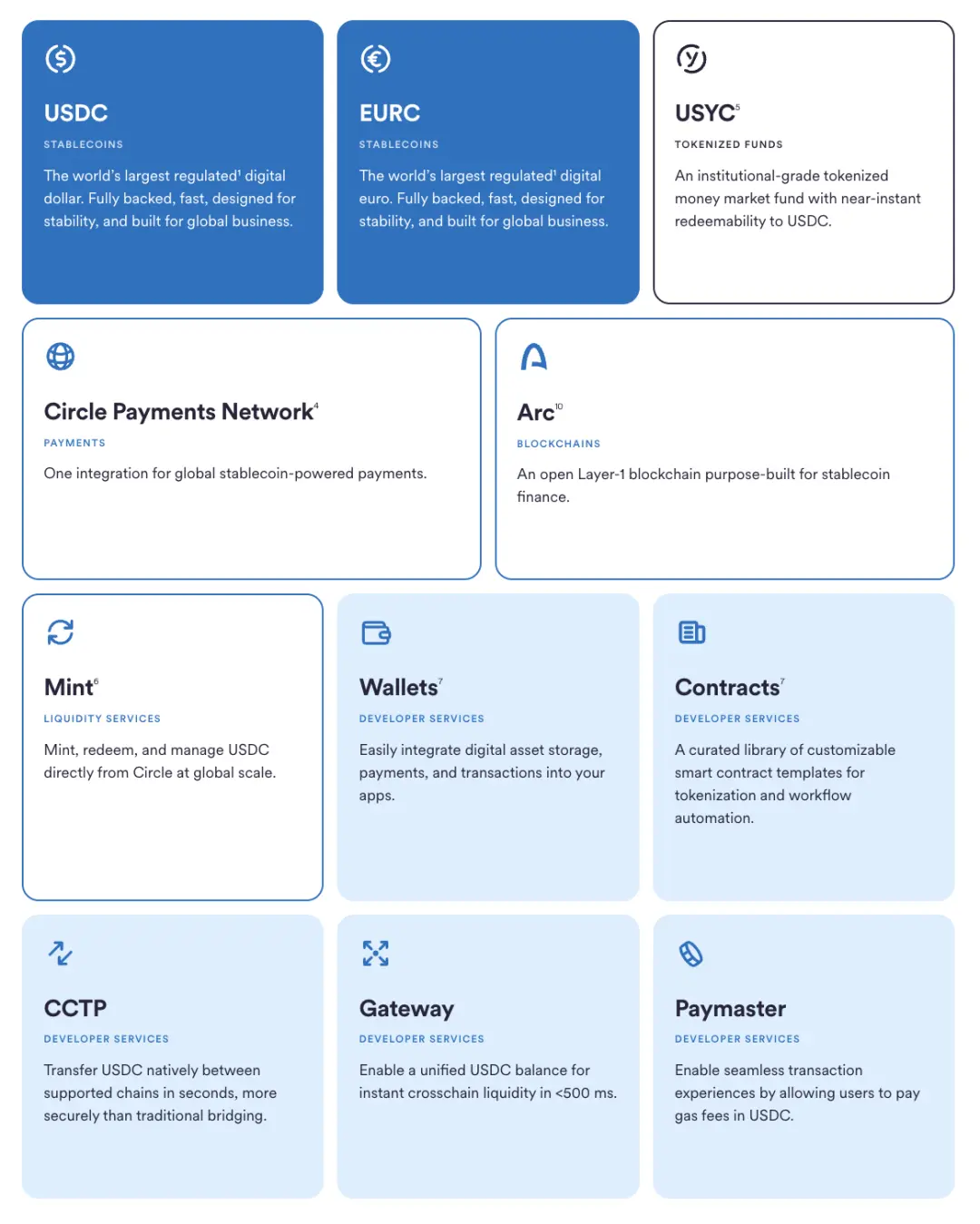 At the same time, Circle's ecosystem development has been cautious and cumulative: it started with the issuance and governance of USDC, then regained control by dissolving Centre and launching programmable wallets. Next came CCTP, which transformed it from relying on cross-chain bridges to adopting a native burn-mint transfer method, thereby unifying cross-chain USDC liquidity. By launching the Circle Payments Network, Circle connects on-chain value with off-chain commerce. Arc is the latest step in this chess game. Flanking these core pillars are services aimed at issuers and developers—Mint, Contracts, Gateway, and Paymaster (with gas fees priced in USDC)—which reduce reliance on third parties and tighten the feedback loop between products and distribution.