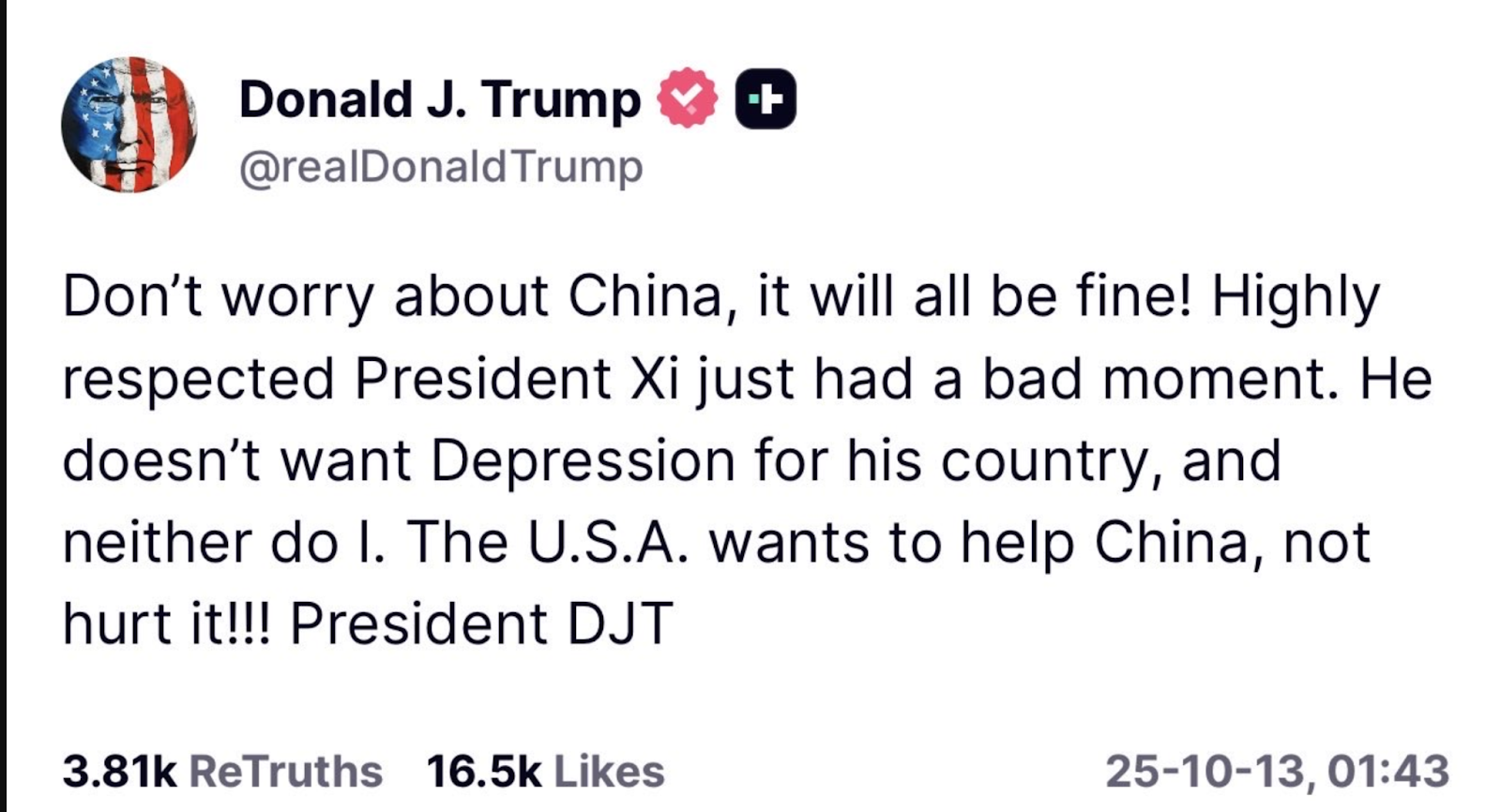 The trigger for this storm was widely attributed to a post by U.S. President Trump on social media—claiming he would impose a 100% tariff on all Chinese goods. However, as the script often plays out, after the market plunged into extreme panic, Trump quickly shifted his tone, signaling a willingness to negotiate with China. Market sentiment warmed after the crash, with Bitcoin recovering above $11,000 and mainstream cryptocurrencies generally rebounding over 10%.