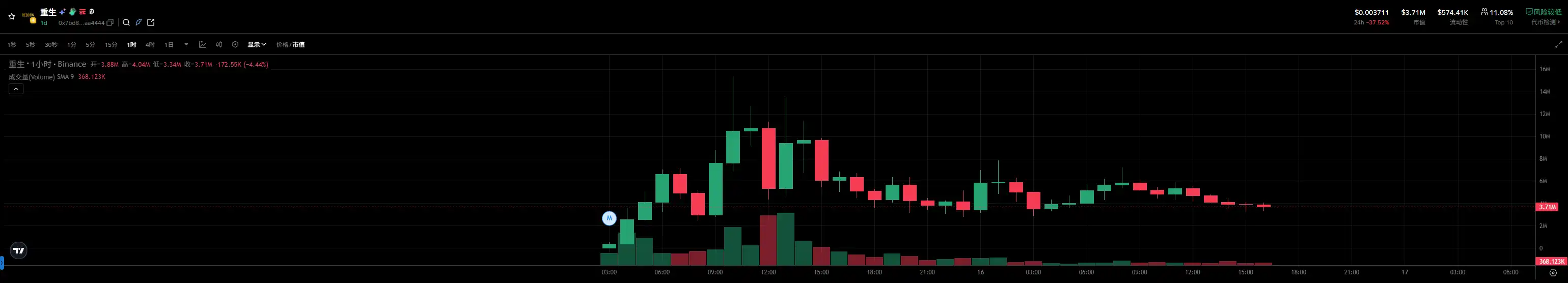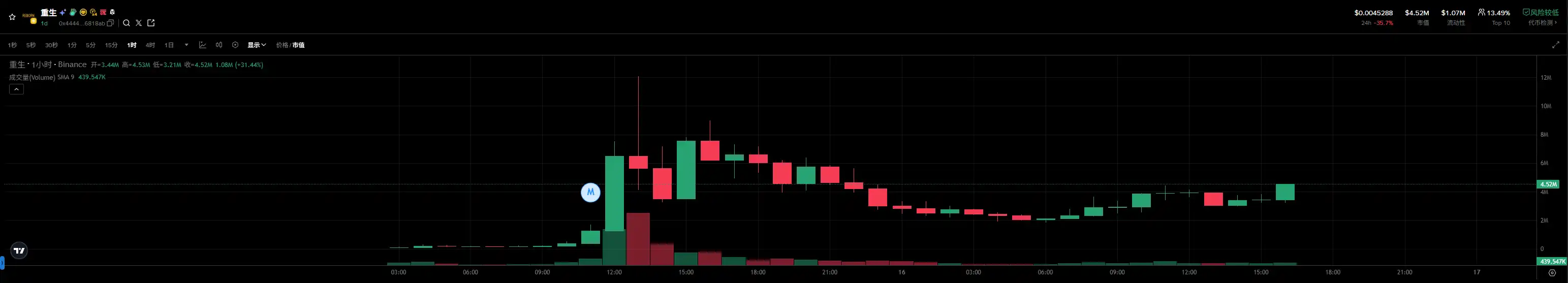 The first "Rebirth" coin that gathered consensus among players and emerged had a contract address ending in "4444." As seen in the K-line chart below, after its successful launch, the "Rebirth" coin with a contract ending in "4444" began to rise, with its market cap once exceeding 15 million dollars.