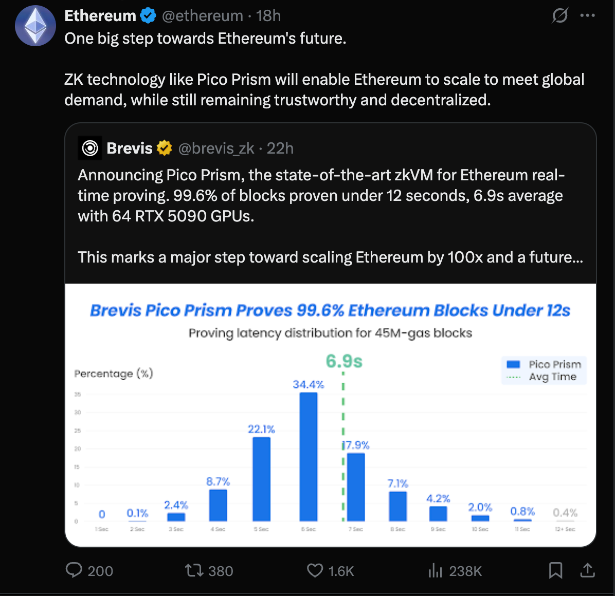 According to the official introduction: “With a cluster equipped with 64 high-end RTX 5090 GPUs, 99.6% of ZK proof tasks can be completed within 12 seconds, averaging only 6.9 seconds.” In the future, “(users can even) verify the blockchain network through their mobile phones.”