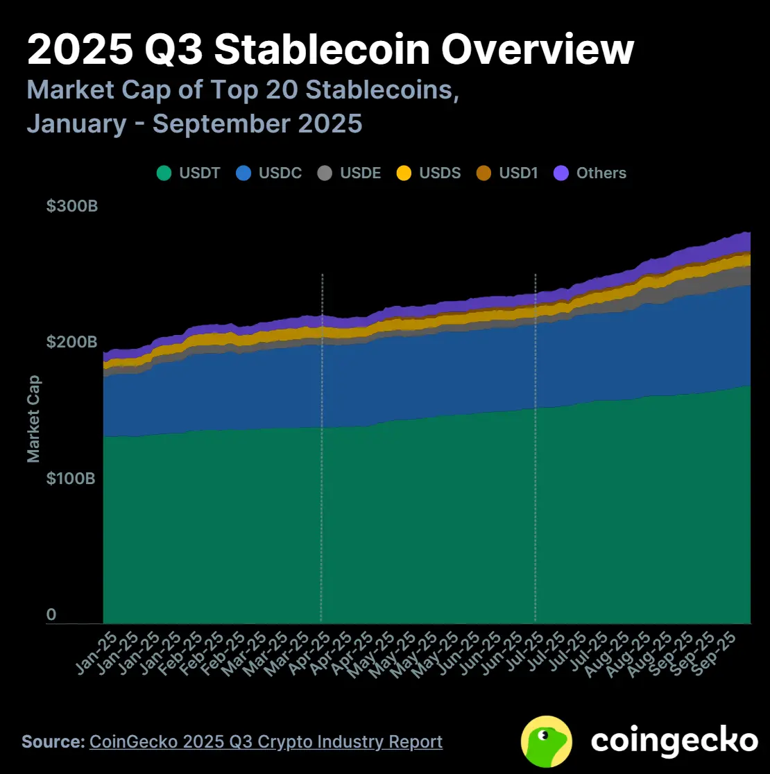 In Q3 2025, the total market capitalization of the top 20 stablecoins grew by +18.3% (+$44.5 billion), reaching $287.6 billion, and continued to rise in early Q4, surpassing $300 billion.