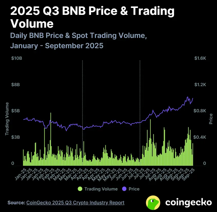 BNB closed Q3 at $1,030 (+57.3%), and continued to rise to a new high of $1,369 entering Q4.