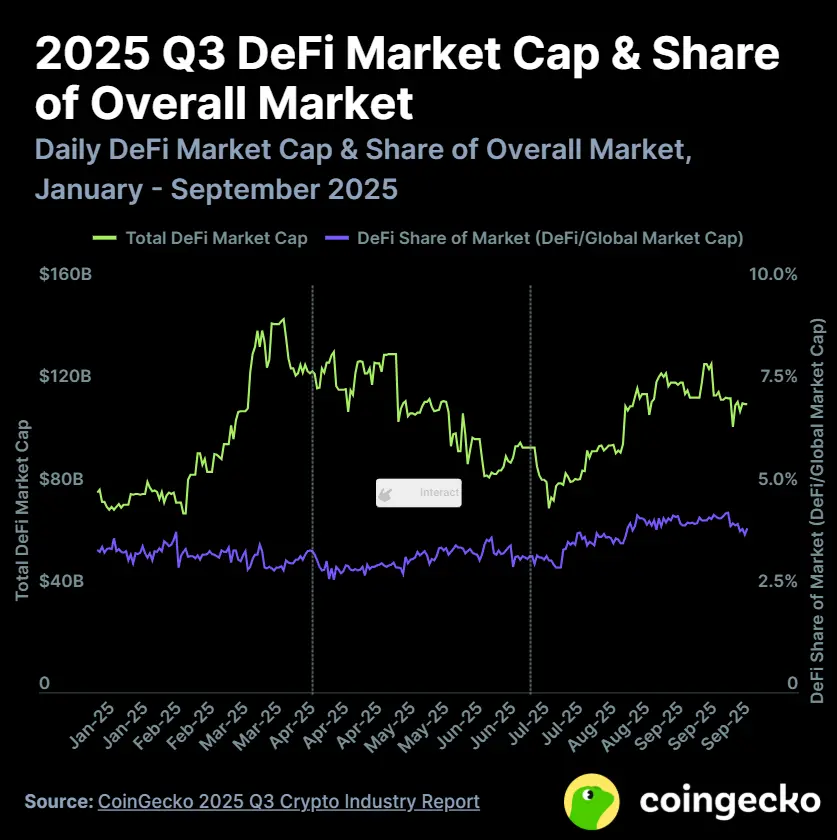 Emerging projects like Avantis (AVNT) and Aster (ASTER) contributed to the overall rebound of the DeFi sector, with market share increasing from 3.3% in Q2 to 4.0%.