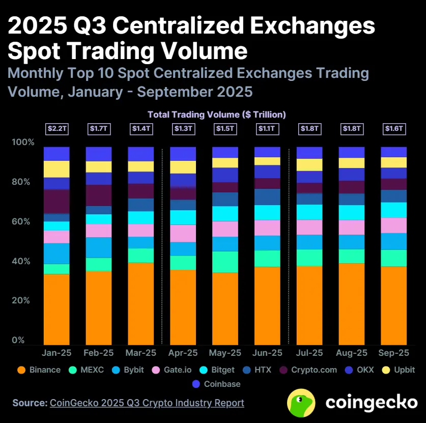 In Q3 2025, the total spot trading volume of major centralized exchanges worldwide reached $5.1 trillion (+31.6% QoQ).