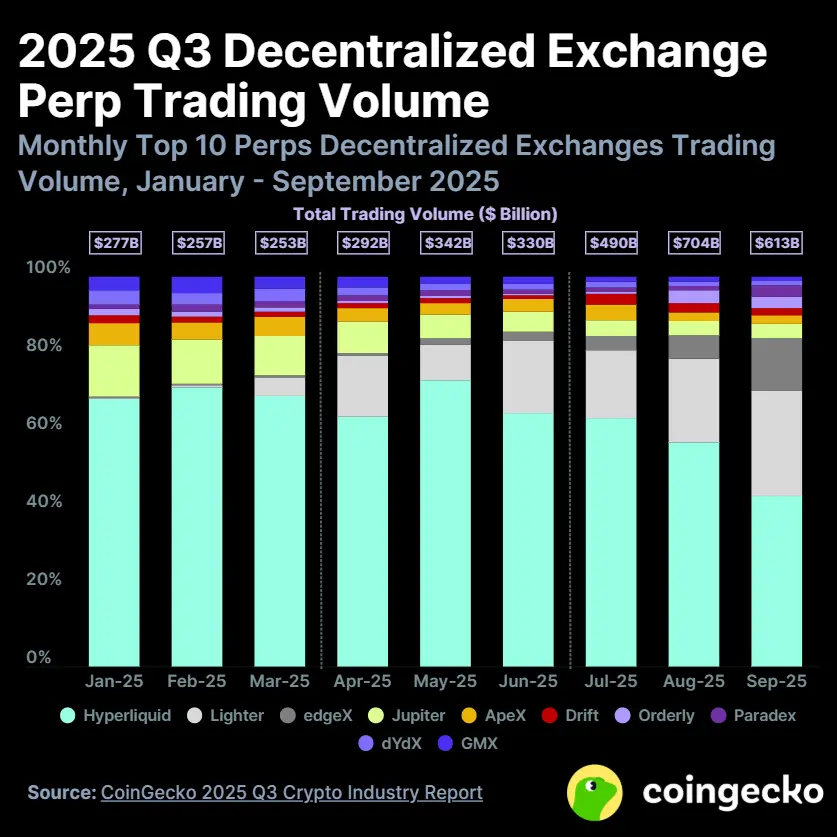 Aster, Lighter, and edgeX emerged as new challengers, with daily trading volume peaking at $84.8 billion (Aster, September);