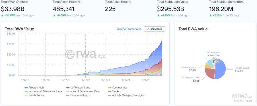 According to the latest data from RWA.xyz, as of October 17, 2025, the total on-chain market capitalization of RWA reached $33.98 billion, an increase of 10.28% compared to the same period last month; the total number of asset holders rose to 485,300, up 6.69% from the same period last month; the total number of asset issuers decreased to 225, indicating a rapid increase in market concentration—leading institutions are gaining dominance while small and medium-sized issuers continue to exit.