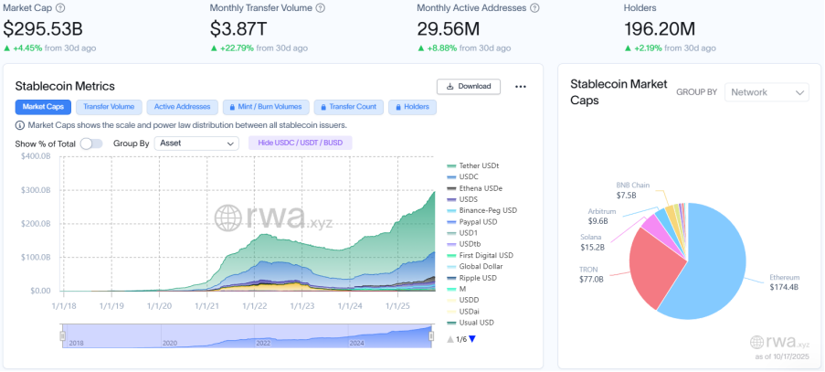 The total market capitalization of stablecoins reached $295.53 billion, an increase of 4.45% compared to the same period last month, with growth rates further slowing; monthly transfer volume surged to $3.87 trillion, a significant increase of 22.79% compared to the same period last month, ending a continuous contraction trend, indicating strong institutional settlement demand rebounding; the total number of monthly active addresses increased to 29.56 million, up 8.88% from the same period last month; the total number of holders is approximately 196 million, a slight increase of 2.19% compared to the same period last month, with both figures continuing to diverge, indicating a structural differentiation intensifying between institutionalization of the market and the retreat of retail investors. The leading stablecoins are USDT, USDC, and USDe, with USDT's market capitalization increasing by 5.66% compared to the same period last month; USDC's market capitalization saw a slight increase of 3.03% compared to the same period last month; possibly affected by the market downturn, USDe's market capitalization growth rate has declined for the first time, decreasing by 7.26% compared to the same period last month.