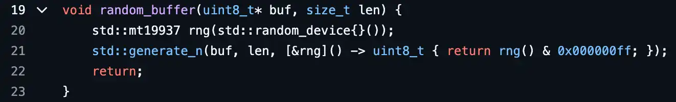 Step 3: MT19937 outputs a 32-bit integer in each round, but not all of it is used; only the highest 8 bits are selected. This means that each round of MT19937 will yield one byte.