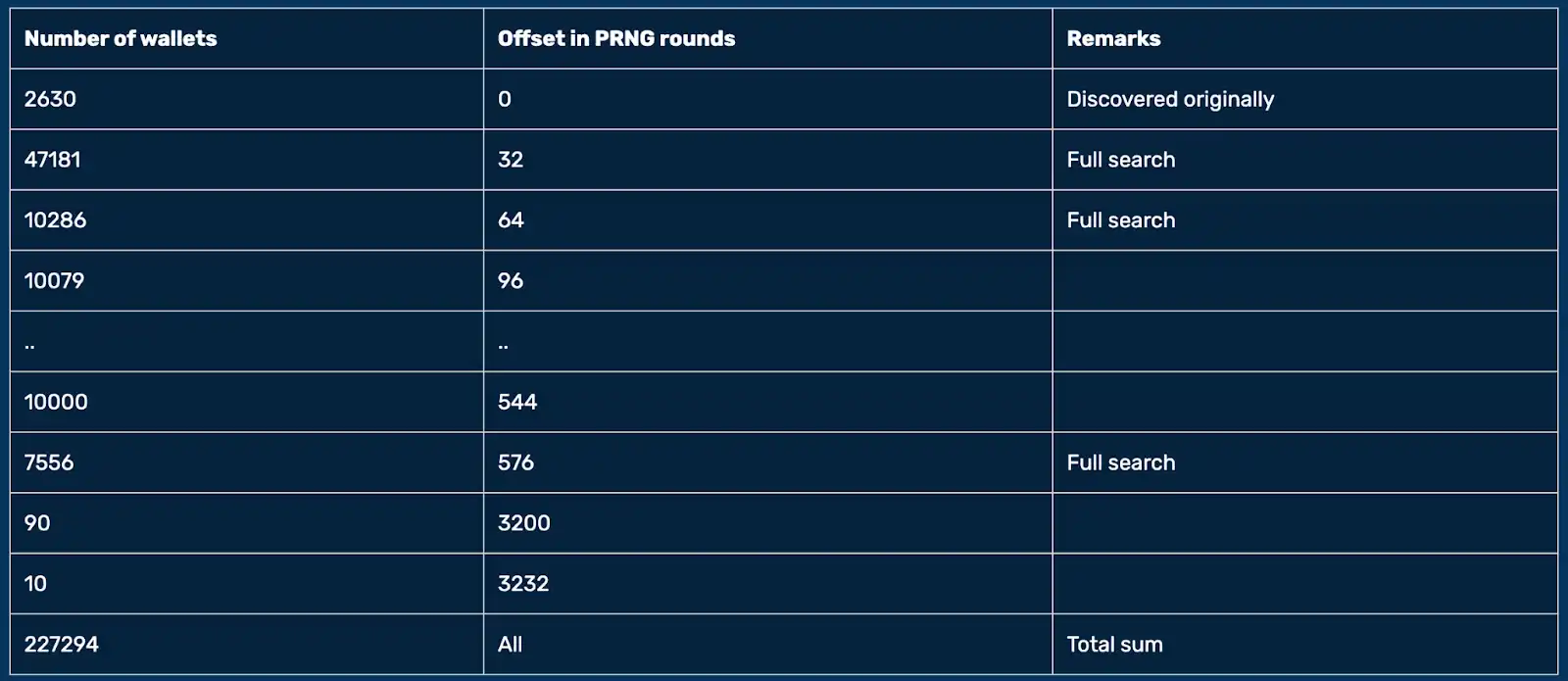 In 2025, with the help of key clues provided by an anonymous white hat researcher, the long-stalled analysis work made breakthroughs. The MilkSad team discovered that the affected software introduced a new parameter—the PRNG offset—when generating private keys, allowing researchers to re-associate previously scattered wallet groups and reveal a unified random number generation pattern behind them. This discovery became key to understanding the causes of the entire "weak wallet" incident [8].