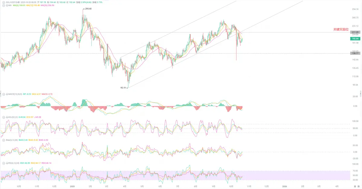 From the short-term trend of SOL, we can observe this information more clearly. First, the K-line from October 11 has completely disrupted the previous upward trend. Secondly, during the subsequent repair process, the index has turned back down upon hitting key areas, which has clearly given everyone a warning. If we cannot repair above the key support level within this week, we may face at least a monthly level correction or even a quarterly level correction in the short term. Therefore, the index trend this week is particularly crucial. It can provide us with directional guidance. Users focusing on short-term operations must remain vigilant, prepare for key points, and make advance trading plans, including preparations for contract hedging positions at critical times, all of which are very important.