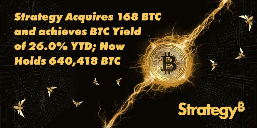 On Oct. 20, Saylor spilled the beans—his bitcoin treasury firm Strategy just grabbed an extra helping of bitcoin ( BTC). Strategy has acquired 168 BTC for ~$18.8 million at ~$112,051 per bitcoin and has achieved BTC Yield of 26.0% YTD 2025,” Saylor stated. “As of 10/19/2025, we hodl 640,418 BTC acquired for ~$47.40 billion at ~$74,010 per bitcoin.”