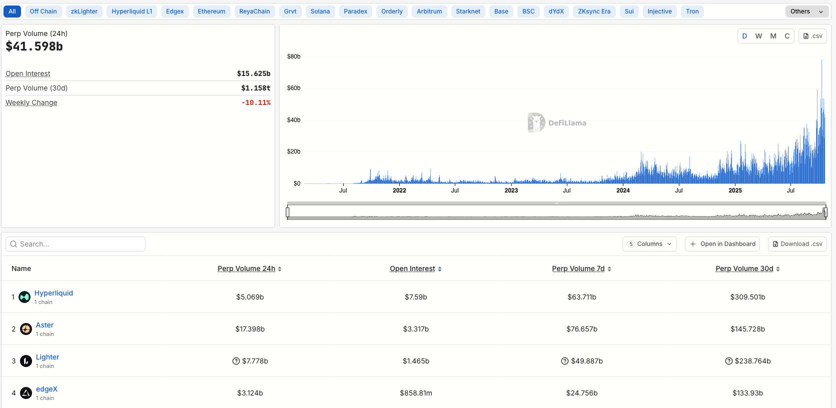 The total 24h volume of Perp DEX is 41B, with an OI of 15B. Hyperliquid remains dominant, accounting for about 50% of OI, Aster for about 20% of OI, Lighter for about 10% of OI, and edgeX for about 5.5% of OI, meaning that F4 collectively occupies about 85% of the market share.
