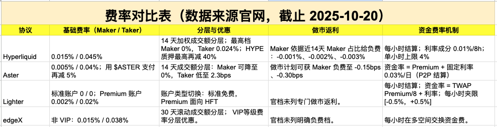 The fee structures of Perp DEX F4 have their own characteristics. In terms of scenario selection, retail and low-frequency traders choose Lighter Standard (0 fees), high-frequency traders choose Lighter Premium, passive market-making and large transactions choose Aster or Hyperliquid, and those sensitive to funding fee fluctuations prioritize Aster and Lighter. edgeX's fee structure seems to lack advantages in various aspects.