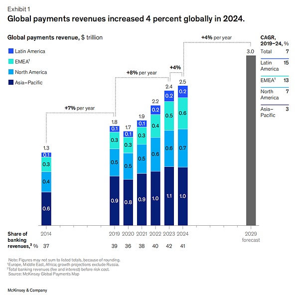 Regionally, Latin America is expected to grow by 11%, while Europe, the Middle East, and Africa (EMEA) and North America are expected to grow by 8% and 5%, respectively, with Asia-Pacific (APAC) declining by 1%. Nevertheless, payments remain the most valuable sub-industry in finance, with an average return on equity of 18.9% in 2024, with some institutions exceeding 100%.