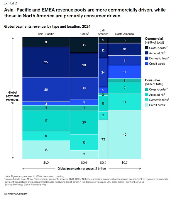 Overall, global payment revenue is almost evenly split between consumer and business segments, but there are significant regional differences.