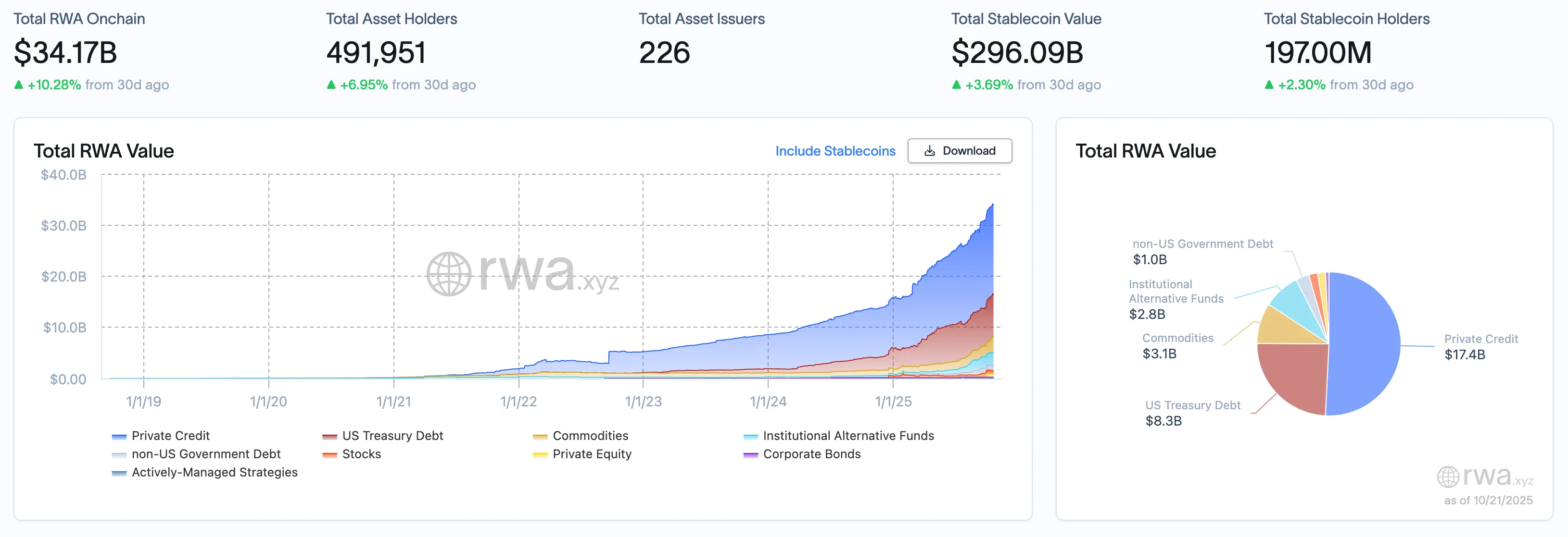 As of October 21, 2025, the total on-chain value of RWA reached $34.17 billion, an increase of $330 million from $33.84 billion on October 14, with a growth rate of 0.98%. The total market capitalization of RWA continues its previous moderate upward trend, maintaining operation within a historically high range, still showing sustained resilience amid short-term fluctuations. The total number of asset holders rose from 482,446 to 491,951, with an increase of 9,505 people over the week, a growth rate of 1.97%. The number of asset issuers increased from 224 to 226, adding 2 new issuers. In the stablecoin market, the total market capitalization rose from $29.384 billion to $29.609 billion, an increase of $2.25 billion, with a growth rate of 0.77%, marking a rebound after a week of decline. The number of stablecoin holders grew from 195.88 million to 197 million, an increase of about 1.12 million people, with a growth rate of 0.57%.
