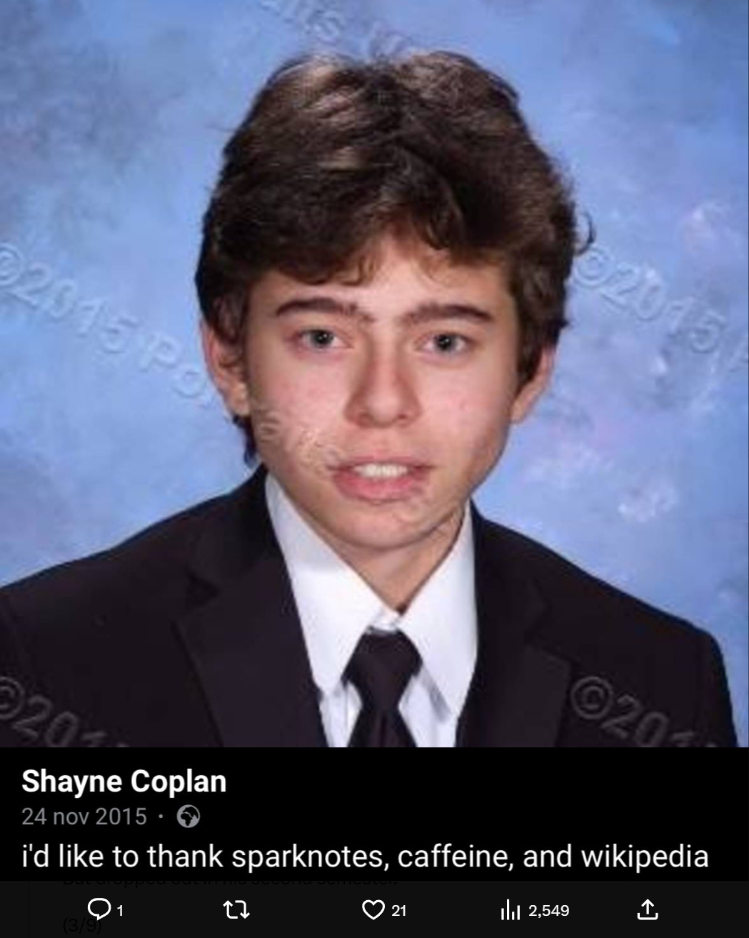 Shayne Coplan's high school graduation summary: "I want to thank Sparknotes (a study website), caffeine, and Wikipedia."