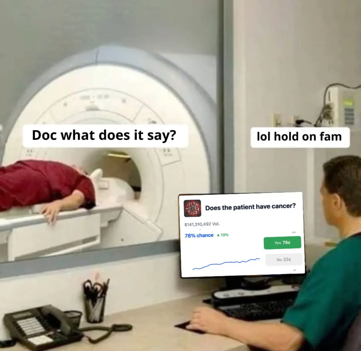 A meme created by a user, indicating that doctors use Polymarket to determine whether a patient has cancer