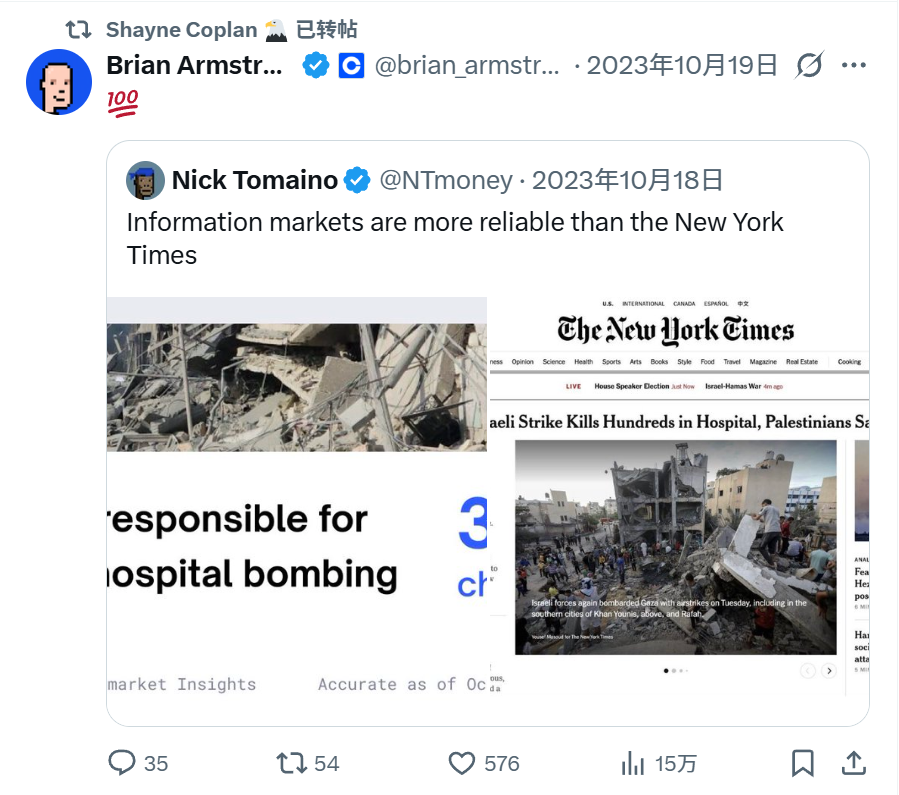 On October 19, 2023, Shayne Coplan retweeted a post about whether Israel should be held responsible for the attack on a Palestinian hospital. The New York Times' answer was yes, while Polymarket's ruling was no. The original poster later deleted the post, and no related records could be found on Polymarket.