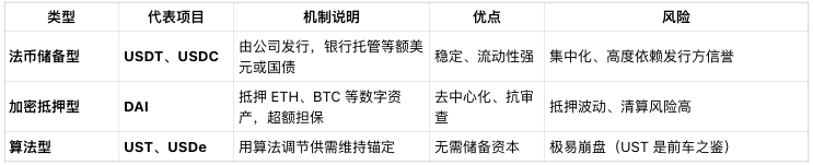 Although they are all called "stablecoins," their underlying mechanisms are completely different. They can be roughly divided into three categories.