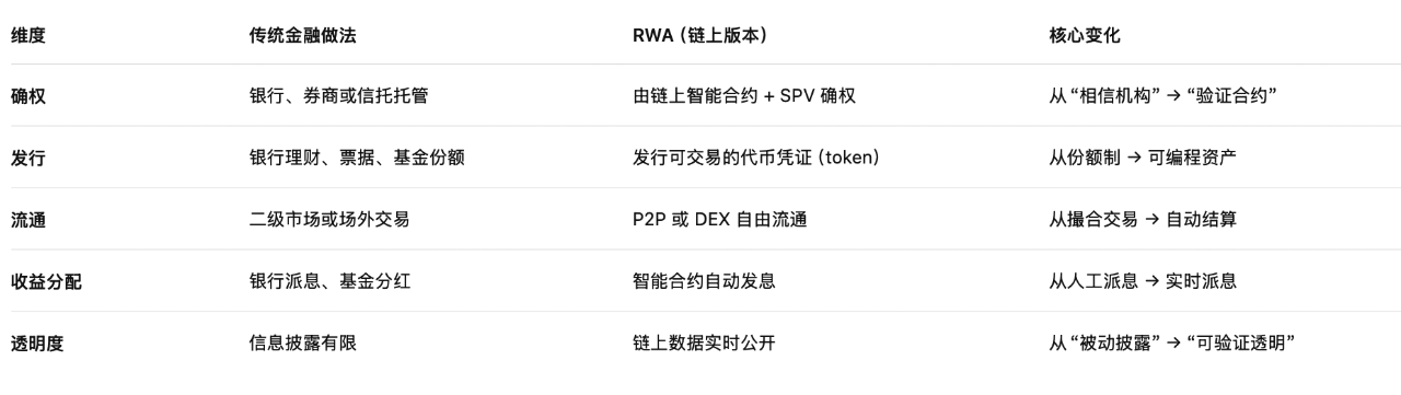 In fact, what RWA does is not unfamiliar at all. In traditional finance, we already have similar mechanisms: asset custody, bill financing, fund shares, income certificates… essentially transforming "static assets" into more liquid and combinable forms.