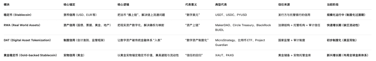 If stablecoins anchor currency credit, RWA anchors asset credit, and DAT anchors institutional credit, then gold stablecoins (such as XAU₮ and PAXG) anchor the oldest and most stable trust of humanity over thousands of years—scarcity and tangibility.
