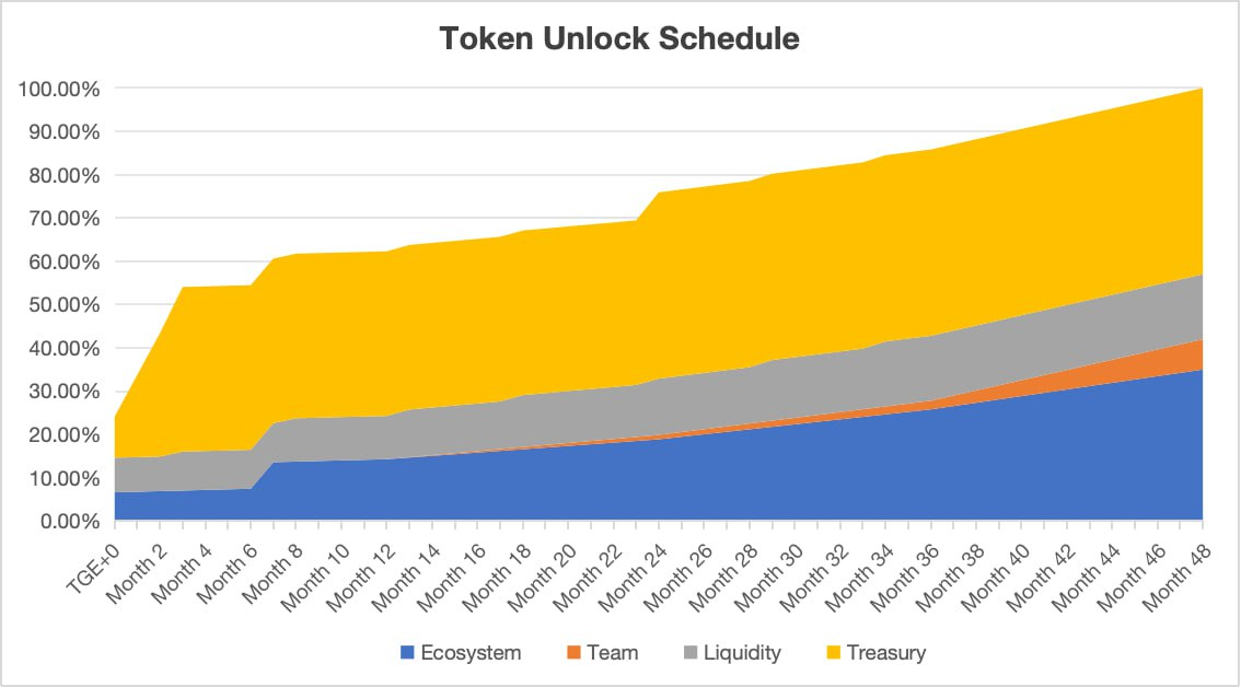 This distribution has several highlights. First, the portion that the community can obtain, combining the 35% ecological incentives and 15% liquidity, reaches a total of 50%.
