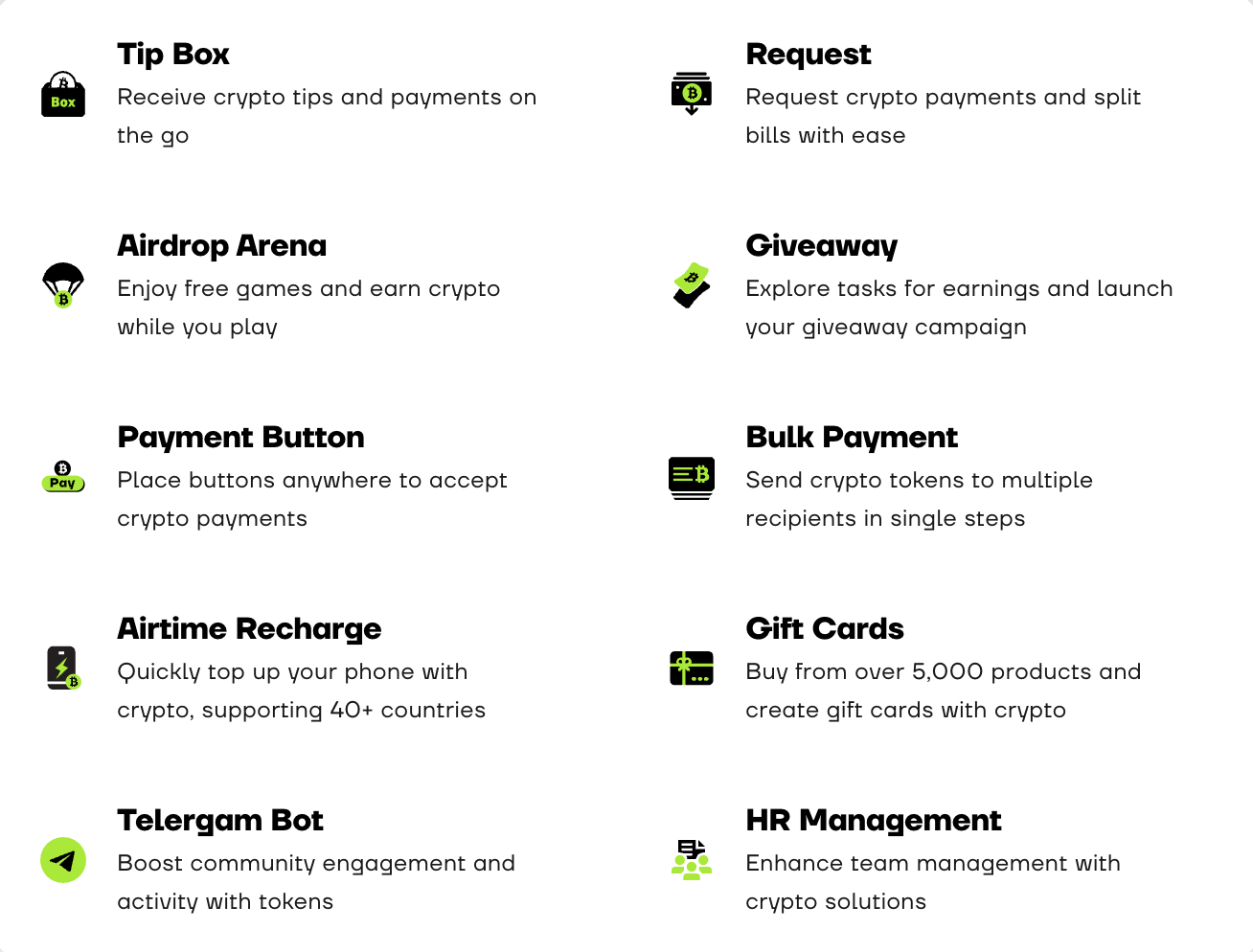 As user aggregation brings more transaction interaction demands, Cwallet continuously innovates features and provides users with a more convenient experience through the combinability of different tools. For example, the giveaway tool focused on community growth automatically verifies tasks, conducts fair draws, and automatically distributes rewards; the batch payment feature allows users to send cryptocurrency to multiple people with one click; and the Airtime top-up service enables users to recharge their mobile phone bills with cryptocurrency anytime, anywhere. Additionally, Cwallet's toolkit includes tipping codes, airdrop arenas, payment buttons, gift cards, and more.
