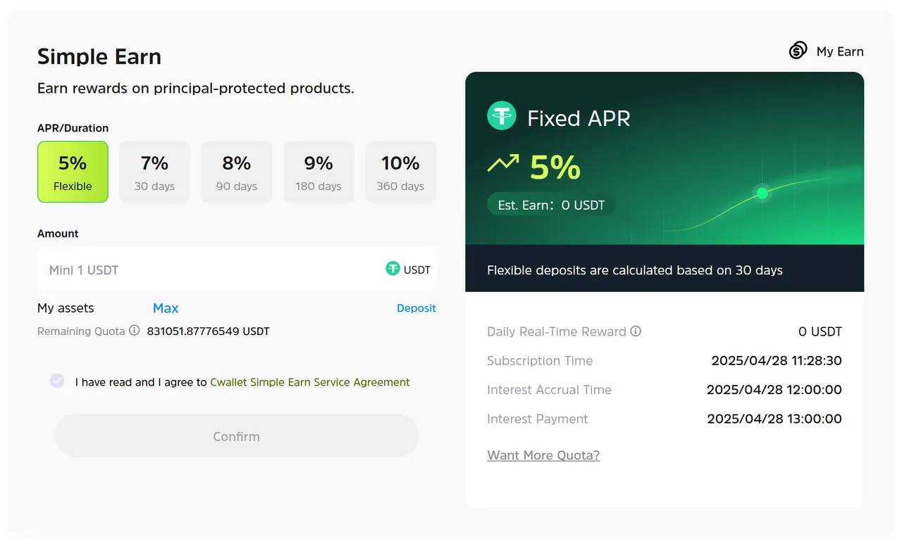 Cwallet Earn supports both flexible and fixed-term modes, allowing users to easily earn returns by locking assets on the function page, with a minimum investment starting from 1 U.