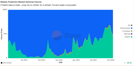 After the issues arise, market challenges follow closely behind. In the predictive market, Polymarket and Kalshi present a competitive landscape. In terms of differentiation, the former offers a more native experience, emphasizing decentralization and covering a broader range of prediction fields, including politics, economics, sports, and entertainment. In contrast, the latter leverages compliance as its competitive edge, being a regulated exchange approved by the U.S. CFTC, making it more attractive to institutional users and outsiders. Although Polymarket currently leads with a significant advantage in trading volume and brand recognition, Kalshi is clearly gaining momentum. Kalshi's market share, calculated based on nominal trading volume through the Dune platform, rose from 8% in January 2025 to 66% in September 2025. Although it has since dropped to 46.6%, the growth momentum remains strong. Even in recent financing, Kalshi is not falling behind, with reports that it is receiving financing offers from venture capital firms, with a valuation range of $10 billion to $12 billion.