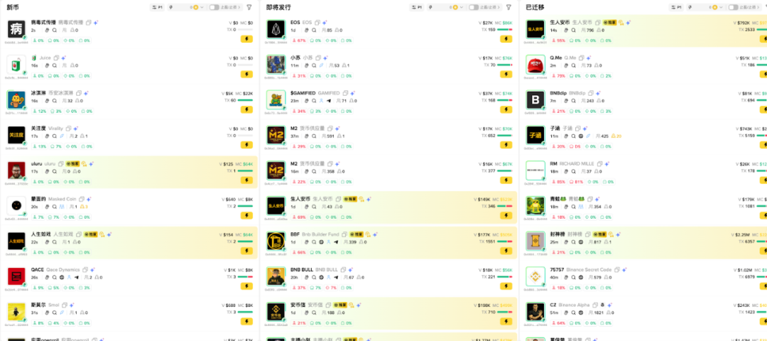 So, how can we leverage Meme Rush to find and participate in early meme projects? Its interface is typically divided into three core areas, representing different stages of projects: new tokens, upcoming releases, and migrated tokens.