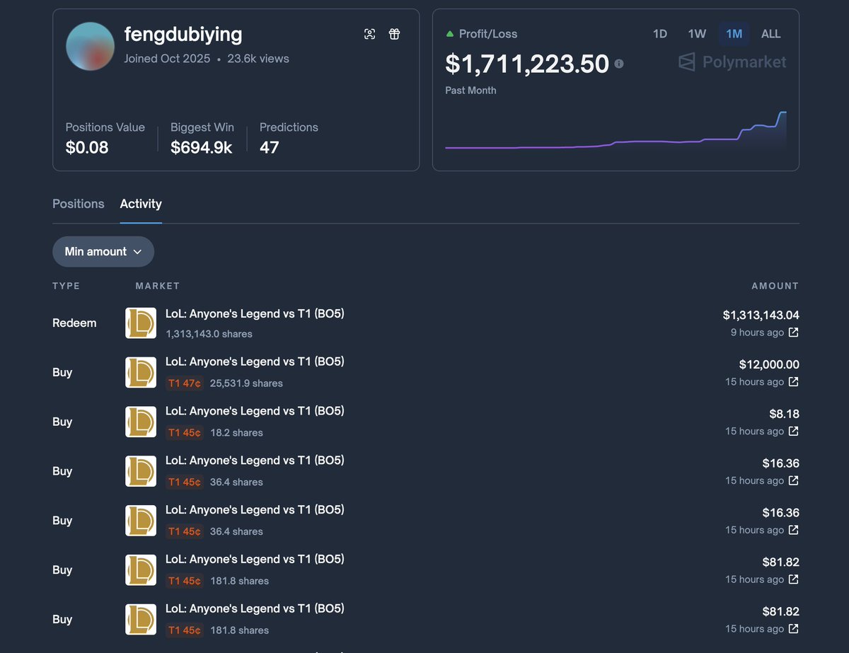 Winning Every Bet: https://polymarket.com/@fengdubiying?tab=activity
