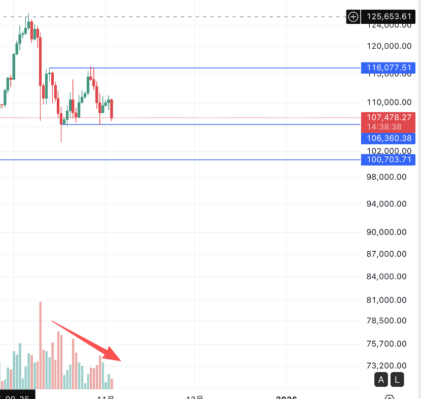 BTC has been oscillating in a range for about 20 days, and the trading volume is gradually shrinking, forming a very standard oscillation pattern. Recently, it has been a relatively calm period; if it breaks below 106,000, be cautious of risks.