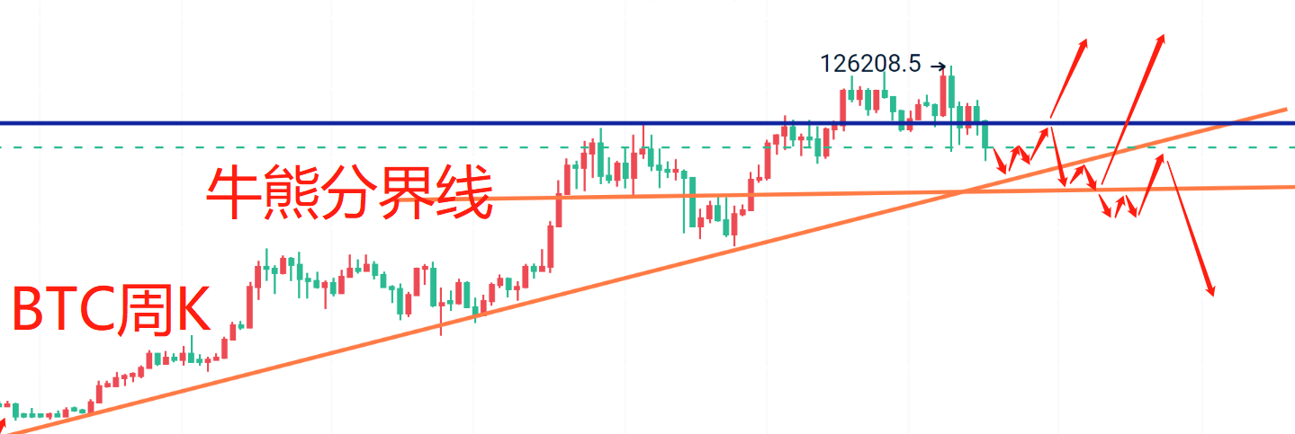 In terms of the drop of around 30,000 dollars, Gege believes that this price fluctuation for Bitcoin is normal, as the unit price is higher than before. This sharp decline can be seen as a liquidation of long positions, a washout. The overall weekly candlestick structure is still above the upward trend line. Now, let me share my views and predictions on bull and bear markets. Although the weekly structure is above the trend line, the MACD's double line death cross still needs further release. Therefore, I define the 90,000 mark as the boundary between bull and bear markets. If the upcoming market does not break below 90,000, or even does not break below 100,000 in a substantial way, and if the subsequent rebound can stabilize above 110,000, then this round of decline is merely a liquidation washout, followed by a bull tail market, with a high point around 131,000. If the upcoming market rebounds but only stabilizes around 110,000, followed by another fluctuation downwards or continued sideways decline, and eventually breaks below 90,000, then if the rebound cannot stabilize above 100,000, the probability of entering a bear market will be very high. The above is my personal view on bull and bear markets; friends with similar thoughts can refer to the above predictions to observe the subsequent market trends and wait for market validation.