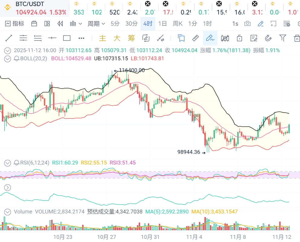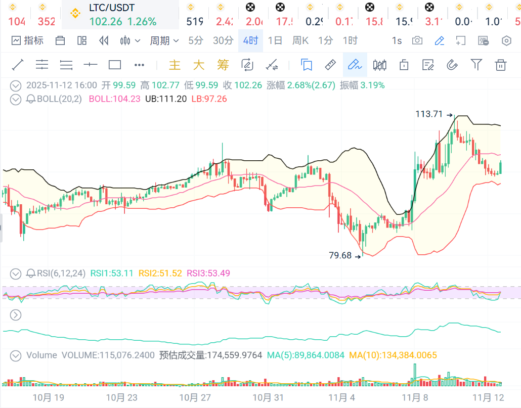 LTC: The price continues to remain below the middle band of the Bollinger Bands, showing weakness, with a support level of 100 and a resistance level of 106.